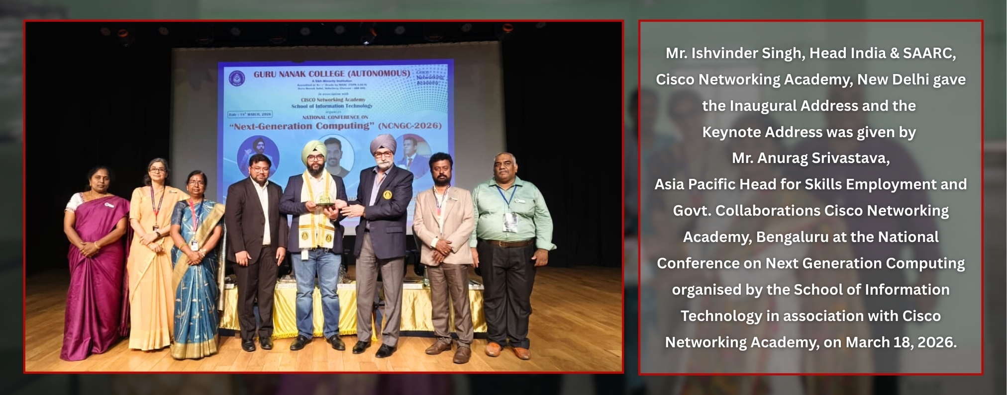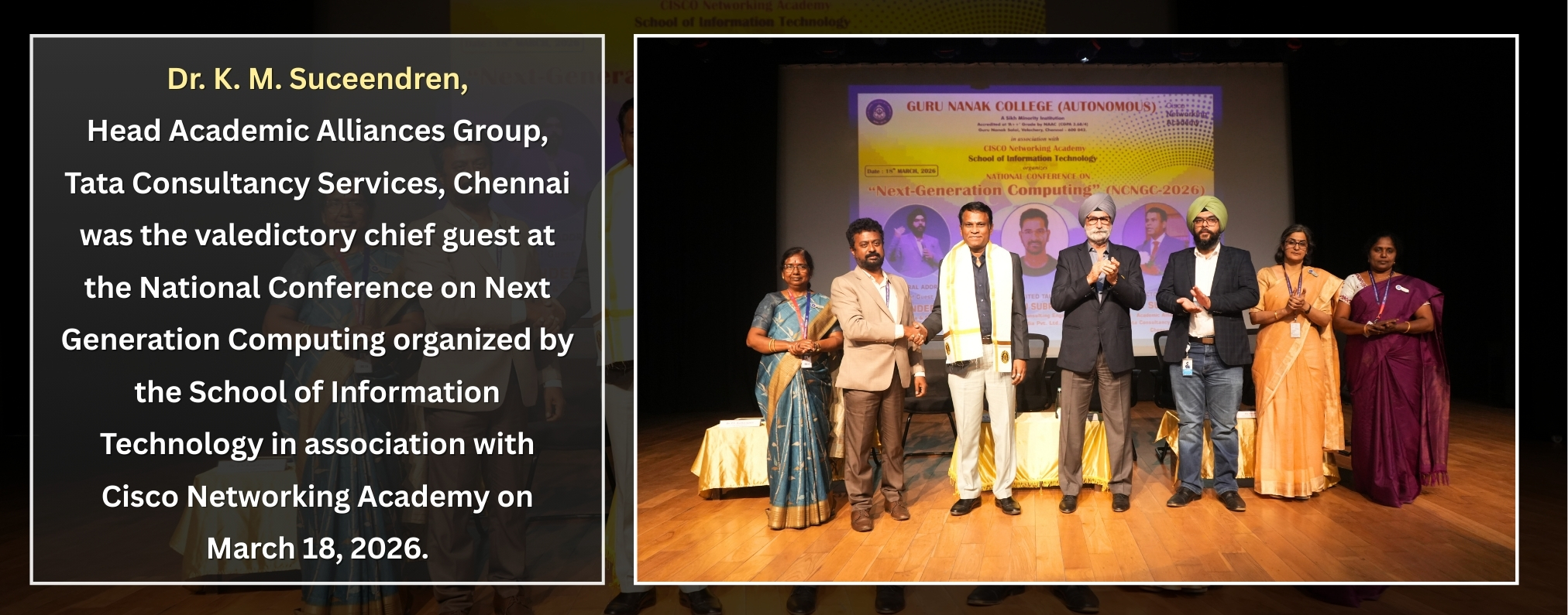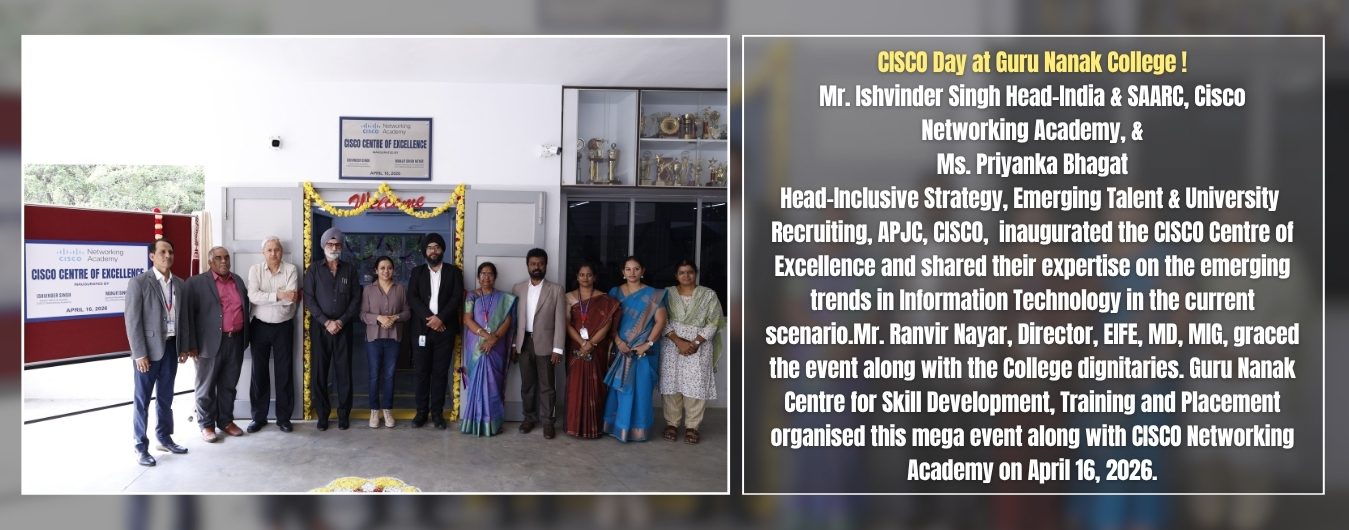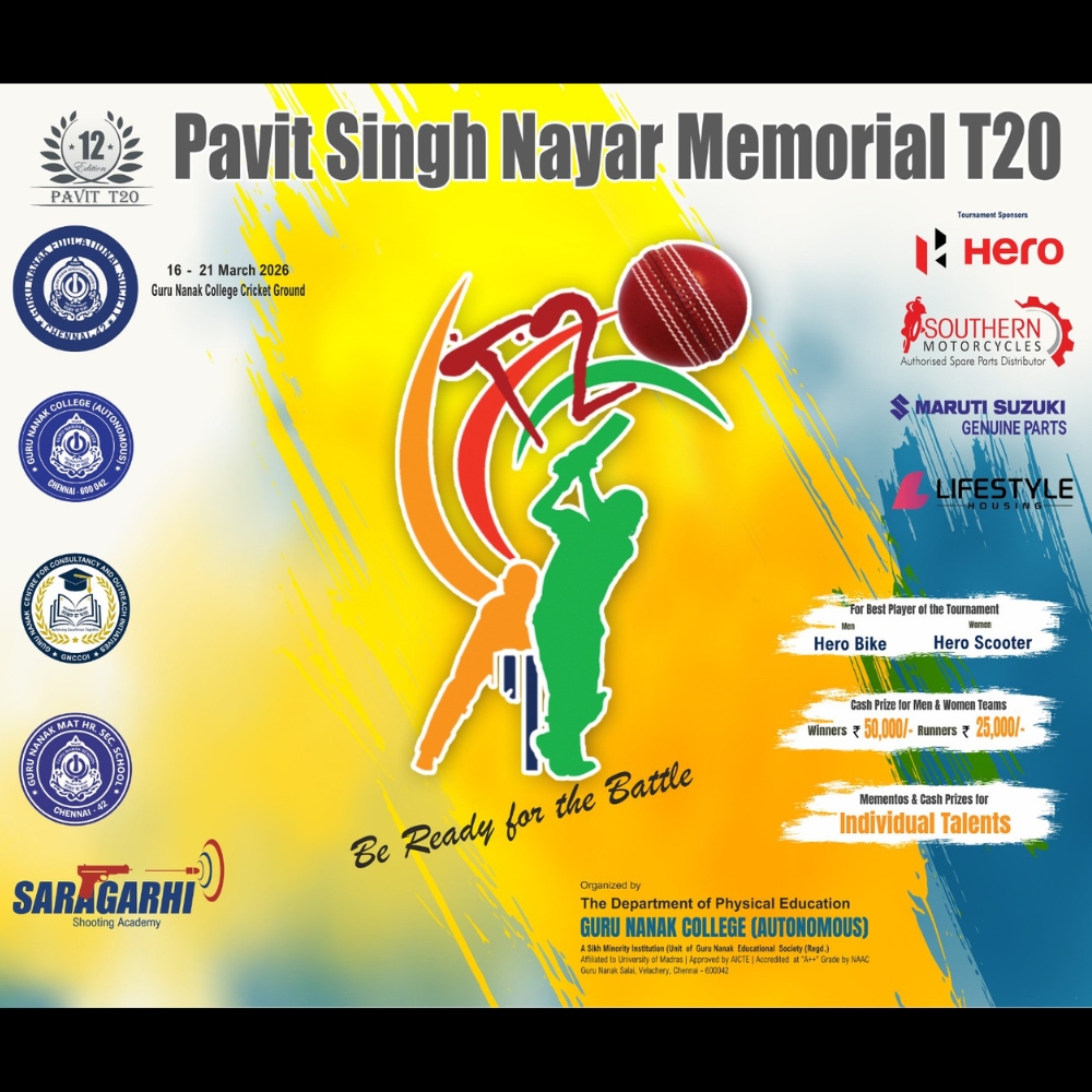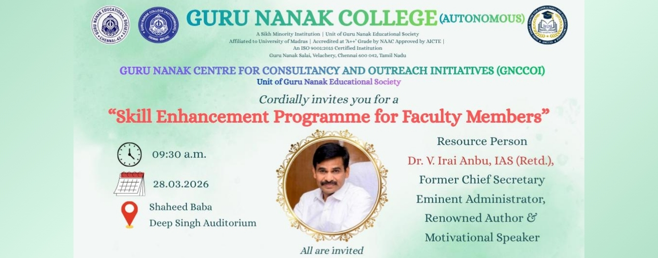 The Guru Nanak College, (GNC) in a lush green 25-acre campus, cradled between the Raj Bhavan and the campus of the IIT-Madras, facing the Guru Nanak Salai, is located in Velachery, South Chennai - the gateway to the IT expressway of Tamil Nadu.