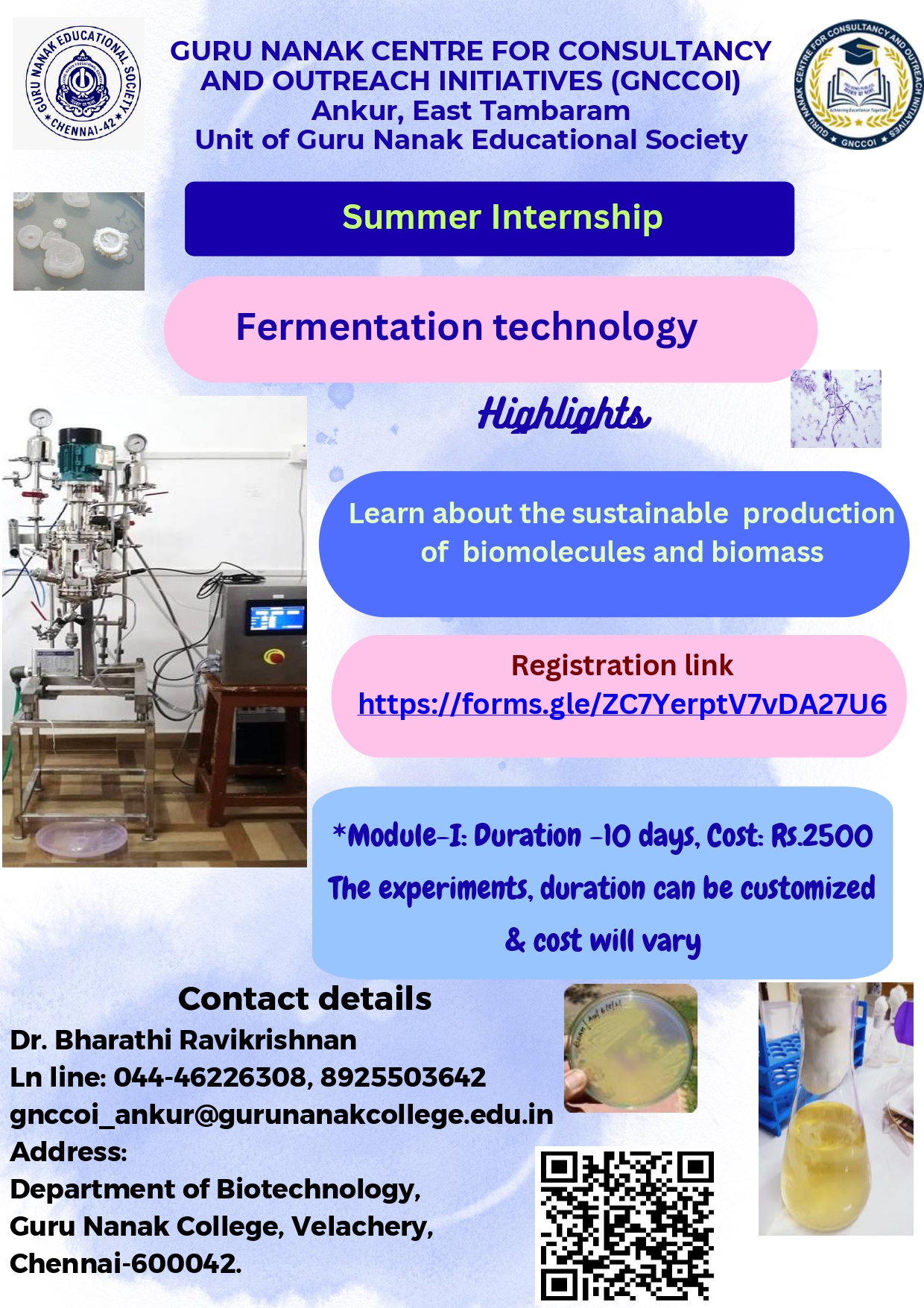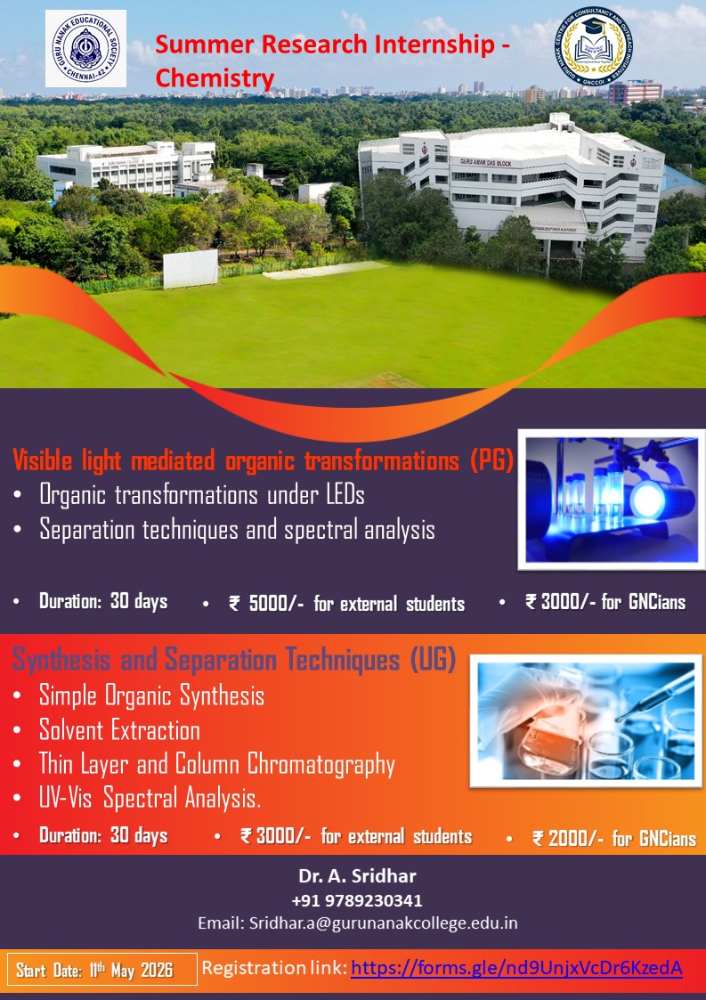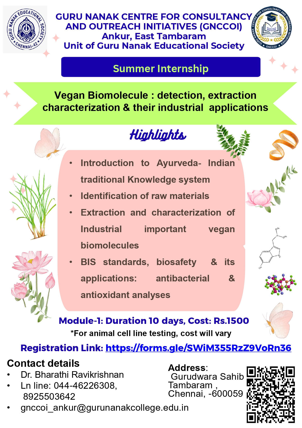 Under the aegis of the Guru Nanak Centre for Consultancy and Outreach Initiatives (GNCCOI), Guru Nanak College (Autonomous), Chennai, successfully conducted a series of specialized summer internship programmes targeting external students, researchers, and academia during May-June 2025. These programs, hosted by different departments, aimed to equip participants with hands-on experience, theoretical foundation, and practical skills in niche biosciences domains.